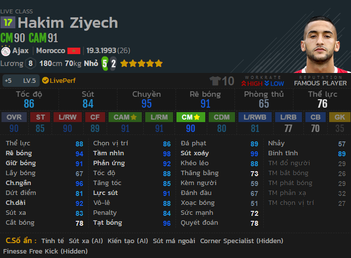 Khả năng rê dắt bóng cũng như chuyền bóng của Ziyech là rất tốt. Cùng với đó là khả năng sút xa cũng như tốc độ khá ổn cho 1 CM có thiên hướng chơi tấn công.