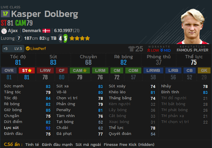 Chiều cao khá lý tưởng với vị trí trung phong khi Dolberg cao tới 1m87. Khả năng đánh đầu của anh chàng này cũng là khá tốt khi có thêm chỉ số đánh đầu mạnh. Mặc dù cao to nhưng Dolberg lại rất linh hoạt với tốc độ tốt, khả năng rê bóng cũng khá ổn với một cầu thủ chỉ số thấp.