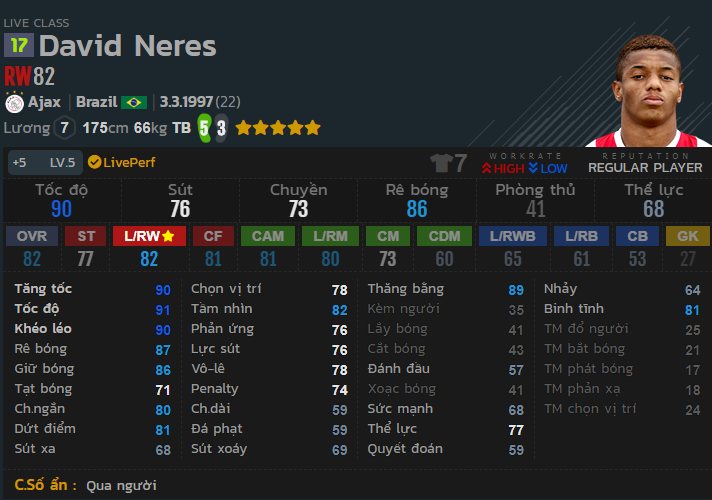 Tốc độ tốt, tăng tốc tốt và cực kì khéo léo là những điểm mạnh của cầu thủ trẻ người brazil. Khả năng thăng bằng tốt và thể hình trung bình khiến cầu thủ này vô cùng khó ngã. Cùng với đó là khả năng sút tương đối ổn so với 1 vị trí cánh.