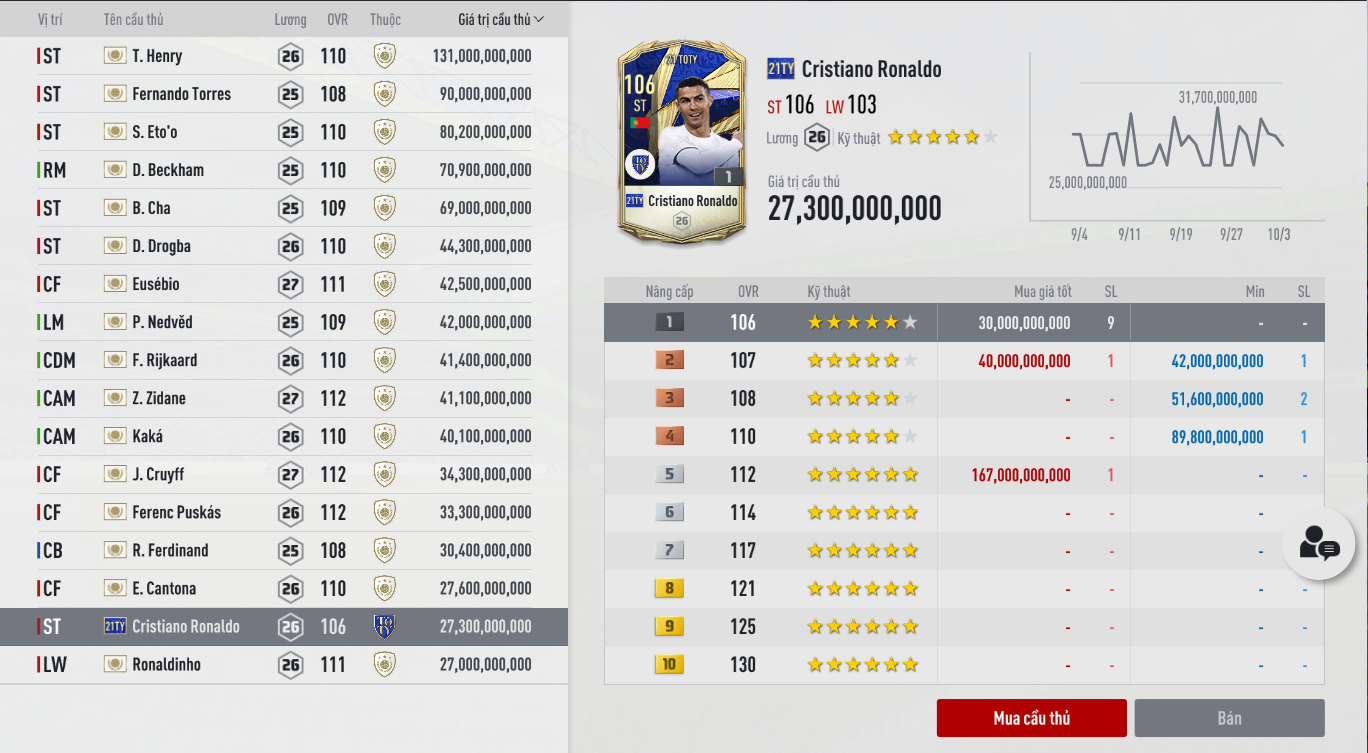 Điều làm các game thủ nước này bất ngờ chính là giá của Ronaldo 21TY đạt mốc 27 tỷ BP và vượt qua rất nhiều ICON. Đáng chú ý giá của Ronaldo 21TY bên Hàn hiện cũng đang có giá 21 tỷ BP