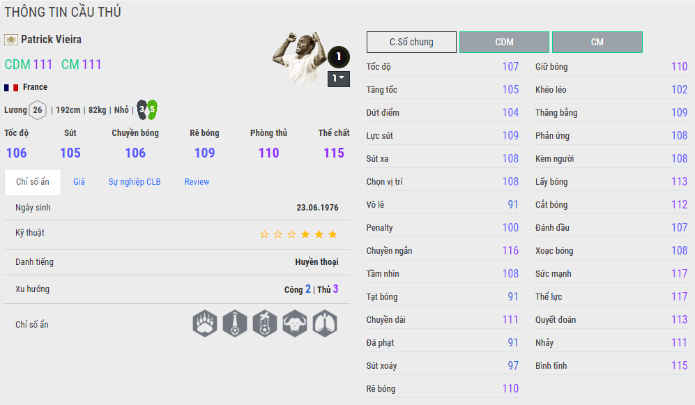 Vieira ICON chuyền tốt hơn nhiều, thậm chí còn rê dắt tốt là đằng khác. Ngoài ra thì AI cắt bóng của tiền vệ này cũng được bước lên một mốc mới. Bạn sẽ được trải nghiệm một CDM yêu thích như thời Fo3, ít nhất cho đến khi có mùa ICON TM của Vieira.