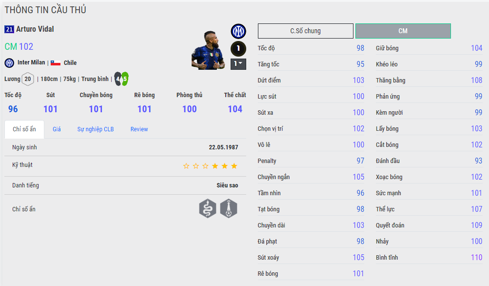 Thật tiếc là hiện tại Vidal đã bị giới hạn nên khó có thể săn được anh trừ khi bạn phải ...bù. Nhưng thực sự đây là phiên bản gameplay đã giúp một tiền vệ con thoi như Vidal đá thực sự lên chân. Không phải ngẫu nhiên mà trong giai đoạn 2014-2018 Vidal vẫn luôn là tiền vệ trung tâm chất lượng nhất nhờ nền tảng thể lực vô cùng sung mãn của mình.