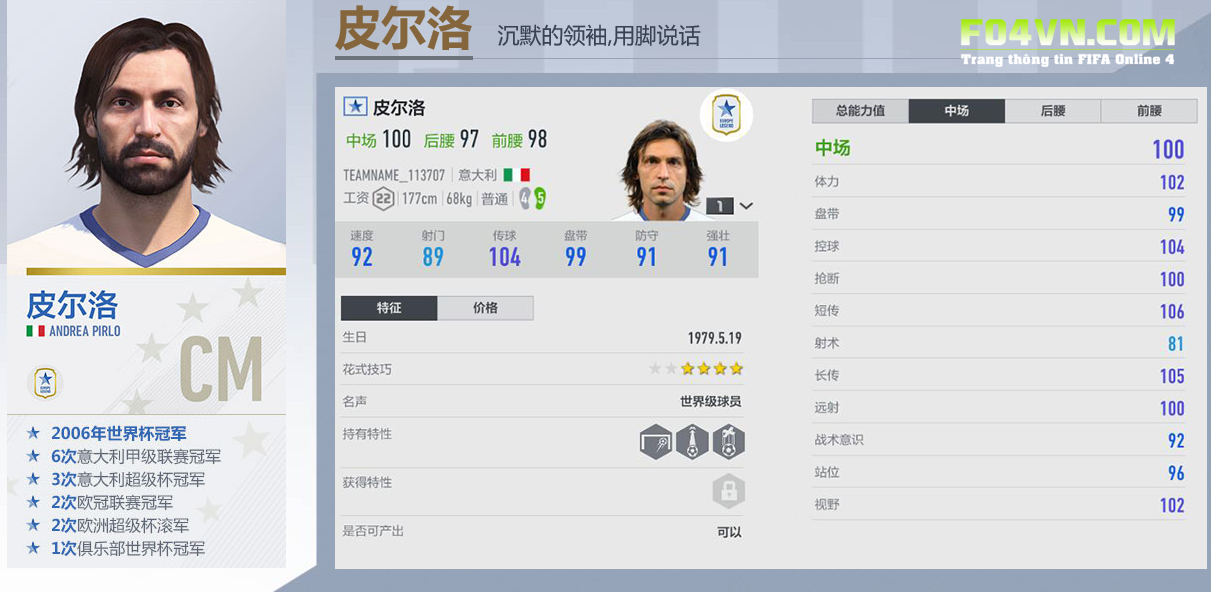 Siêu tiền vệ người Ý - Pirlo - với bộ chỉ số cực kì xanh mượt, thậm chí chỉ số chuyền bóng ở mức "Tím ngắt" tới 104, có vẻ đây sẽ là một cầu thủ có khả năng "chuyền như đặt vào chân đồng đội" ở mức tối đa nhất. Bên cạnh rê bóng 99 có lẽ sẽ phản ánh phần nào độ chân thực về lối chơi bóng kỹ thuật nhẹ nhàng và đầy thong dong của Pirlo. Khá thú vị phải không nào.