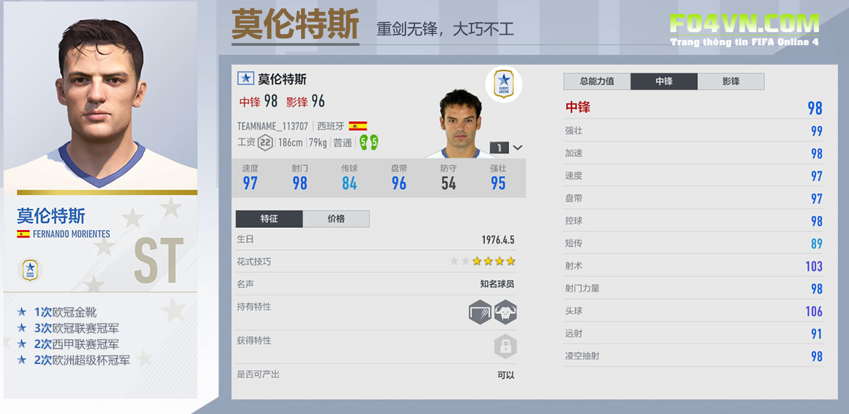 Tiền đạo nổi tiếng người TBN - Morientes - Với tốc độ trung bình lên tới 97 thực sự sẽ biến Morientes trở thành một máy chạy thực thụ cùng với thể chất 95 sẽ làm cho thanh niên này khó mà bị đốn ngã. Nhưng quan trọng hơn cả, với Sút 98 và 2 chân 5-5 thì thôi rồi, có lẽ đến những huyền thoại thủ môn như Yashin trong game cũng sẽ phải dè chừng đây. Quá bá đạo phải không nào.