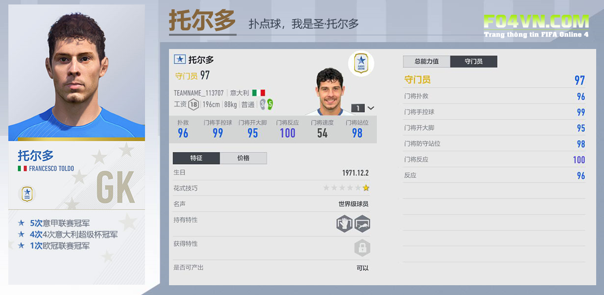 Với những fan bóng đá lâu năm, đặc biệt là bóng đá Italia có lẽ không xa lạ với cái tên Toldo. Bộ chỉ số của a trong thẻ này cũng "tím ngắt" như người đồng hương Pirlo của mình. Với khả năng bắt bóng lên tới 99 cùng với phản xạ 100, chắc chỉ anh ta mới cản được những cú sút của Siêu tiền đạo Morientes kể trên mà thôi.