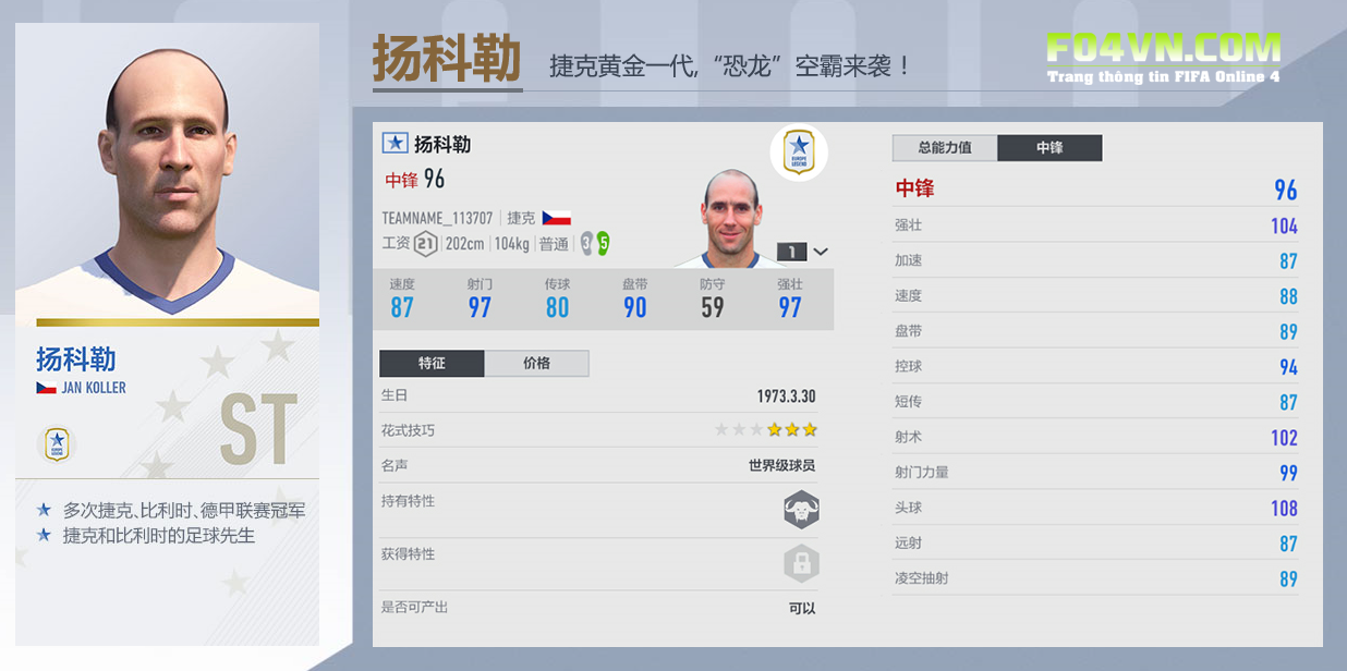Tiền đạo cao 2m2 người Cộng hoà Séc là tiền đạo thứ 2 trong số các huyền thoại châu âu được cập nhật tại bản FO4 Trung Quốc, Khác với sự linh hoạt nhanh nhẹn của Morientes thì Koller cho thấy sức khoẻ khủng khiếp, chiều cao cực kì lý tưởng và khả năng không chiến khỏi phải bàn cãi. Đây có lẽ là đối trọng bậc nhất trong việc so kè sức vóc với Tony Adams ở trên.