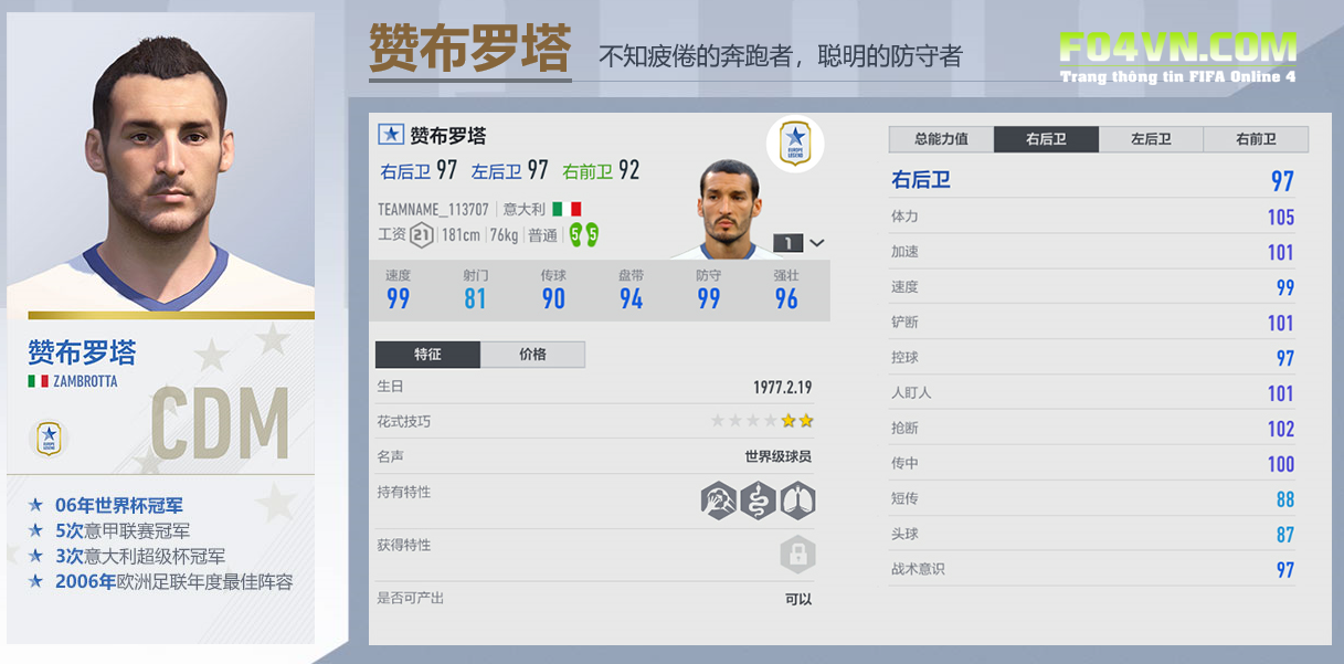 Có vẻ FO4 Trung Quốc khá ưu ái các danh thủ của đất nước hình chiếc ủng khi có tới 3 trên 6 cầu thủ mang quốc tịch Italy. Zambrotta ở thẻ này mang tốc độ 99, quá khét với 1 CDM. Cùng với kỹ năng phòng ngự 99 và chỉ số ẩn "Người không phổi". Đây sẽ là máy quét bậc nhất khu vực tuyến giữa. Khó có ai thoát được sự theo kèm của cầu thủ này.