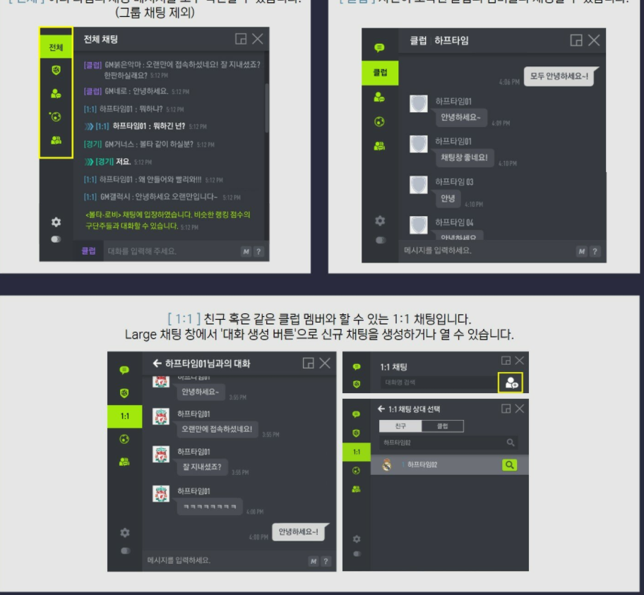 Hiện tại Nexon cho phép bạn thực hiện các kiểu chat sau : 1vs1 ( thông thường ), nhóm bạn do bạn tự tạo, chat CLB, chat theo kênh. Cái này gần giống với các tựa game kiếm hiệp hiện nay.