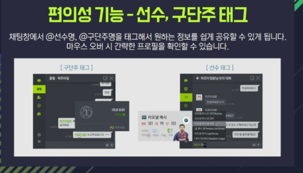 Một tính năng khá thú vị là bạn có thể tag cầu thủ trong đội hình của bạn vào kênh chát, người xem sẽ click vào đó để xem cầu thủ của bạn. Một tính năng khá giống với game Trung Quốc.
