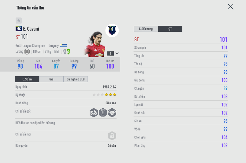 Trong danh sách những cái tên dứt điểm khét nhất sau update thì Cavani MC đứng hàng thứ 7. Thậm chí còn trên rất nhiều các ICON trong game. Hãy cùng Fo4vn điểm qua những thay đổi của chàng tiền đạo Uruguay này.