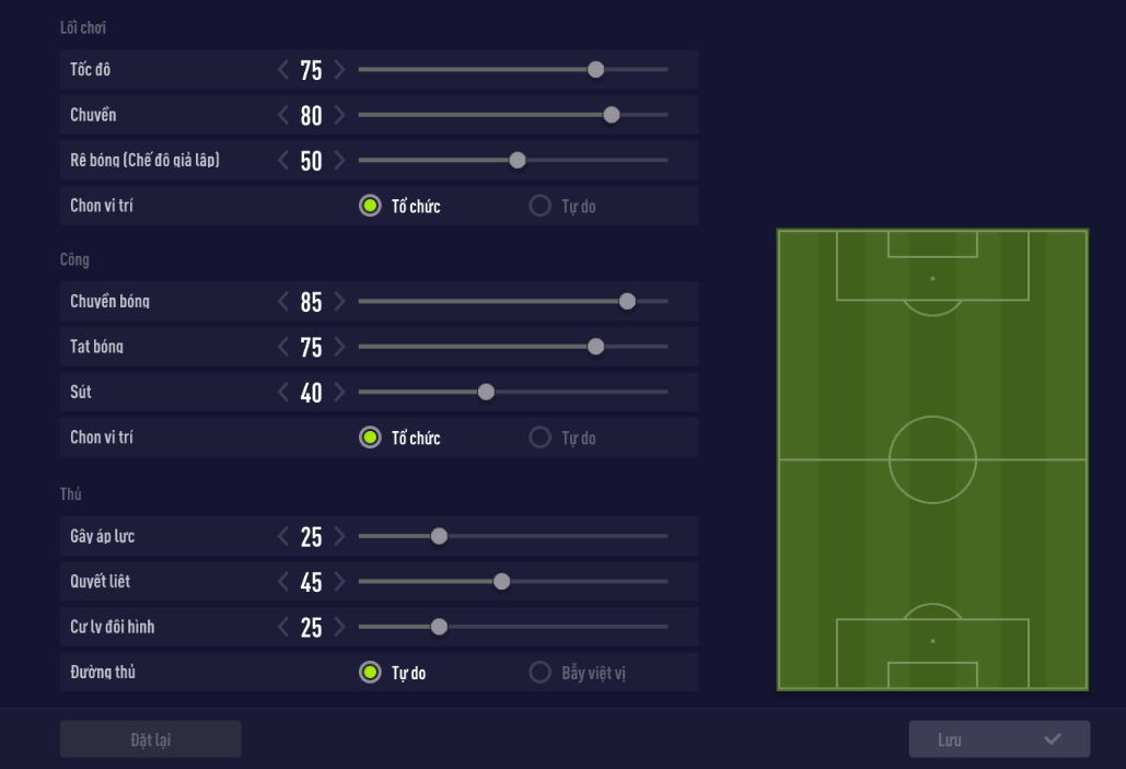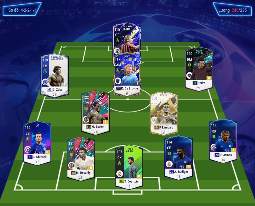 Lối đá là tương đối đơn giản và phụ thuộc rất nhiều vào hai cầu thủ tiền vệ ( tiền đạo ) cánh, những người sẽ thường xuyên nhận những đường bóng dài từ phần sân nhà để bứt tốc và đưa bóng vào trong cho tiền đạo hay tiền vệ công ghi bàn. Để đảm bảo được việc bóng được phát động từ phần sân nhà có được độ chính xác cao, như ở trên các bạn có thể thấy HLV này chọn Lampard ICON TM đá ở vị trí CDM, nghe có vẻ hơi phí một chút nhưng rõ ràng với AI của một cầu thủ hàng đầu thì những cú chuyền bóng vượt tuyến sẽ có điểm rơi tốt hơn.