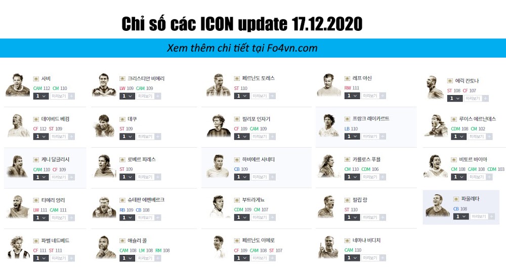 Sáng nay, ngày 17.12.2020 sever Hàn Quốc đã chính thức update các tính năng mới, TTCN mùa hè và hơn là là 25 ICON mới được đưa vào game, Đáng chú ý là có sự xuất hiện của Torres, Vidic, Berkham.
