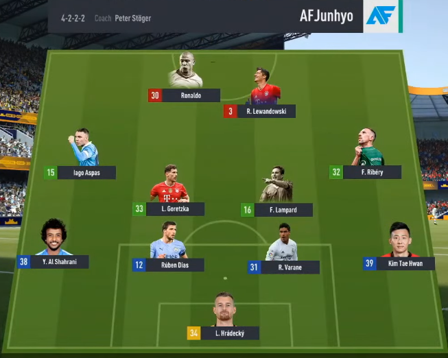 Đây là đội hình mà Junhyo sử dụng tại giải FECC 2021, tất nhiên do việc chọn lựa cầu thủ còn phụ thuộc rất nhiều vào hai người đồng đội nên có thể đôi khi khó phát huy hết sở trường của anh chàng này.