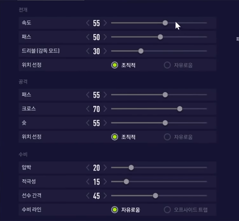 Bảng chiến thuật đội với phần áp lực và quyết liệt được hạ cực thấp, dễ hiểu khi không chỉnh xu hướng cho hậu vệ thì JunHyo sẽ để chiến thuật thấp như vậy nhằm tránh các cầu thủ ở hàng thủ dâng cao. Trong khi đó điểm tạt bóng lại khá cao cùng với chơi chuyền bóng kết hợp trung bình. Nhằm đảm bảo tính sáng tạo và đa dạng trong lối chơi.