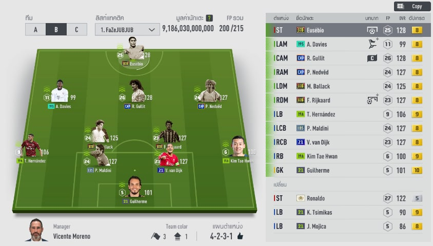 Có thể thấy mức lương của đội hình này mới chỉ có 200/215. Tất nhiên khi ở trình độ cao thì họ chỉ cần cầu thủ hợp tay chứ không cần quá khủng hay phải áp đảo về mặt chỉ số. Nhưng bộ khung chính vẫn là những cầu thủ cực cao to và có sải chân dài ở trục dọc. Maldini và Van Dijk vẫn là hai cái tên chưa bao giờ lỗi thời. Cũng có thể đây cũng là sự chuẩn bị trong trường hợp nếu như khi vào giải Seagame họ không chọn được Rudiger hay Varane.