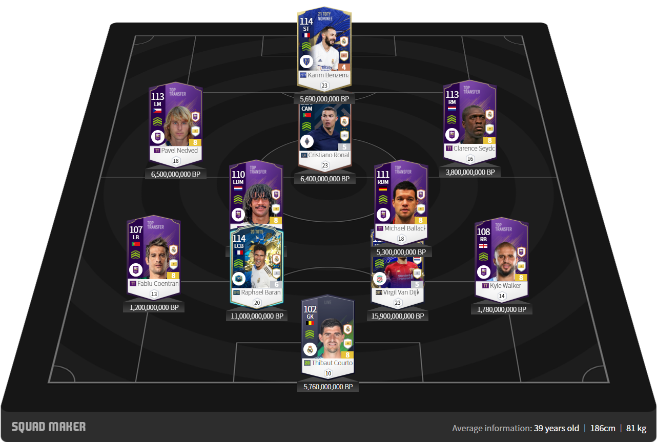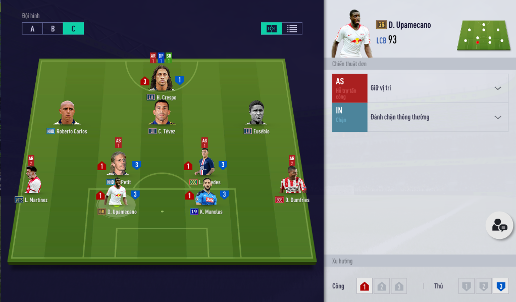 Tất nhiên hàng phòng ngự vẫn là cặp đôi đi cùng năm tháng Varane 20TS cùng Van Dijk. Tuy nhiên tổng quan thì các thẻ TT xuất hiện khá nhiều. Lợi thế của mùa TT là hai vị trí hậu vệ cánh có mức lương khá rẻ nhưng chất lượng sử dụng cao. Seedord và Ballack tuy không có ở Việt Nam, nhưng các bạn có thể bù lấp bằng Vieira và Bale