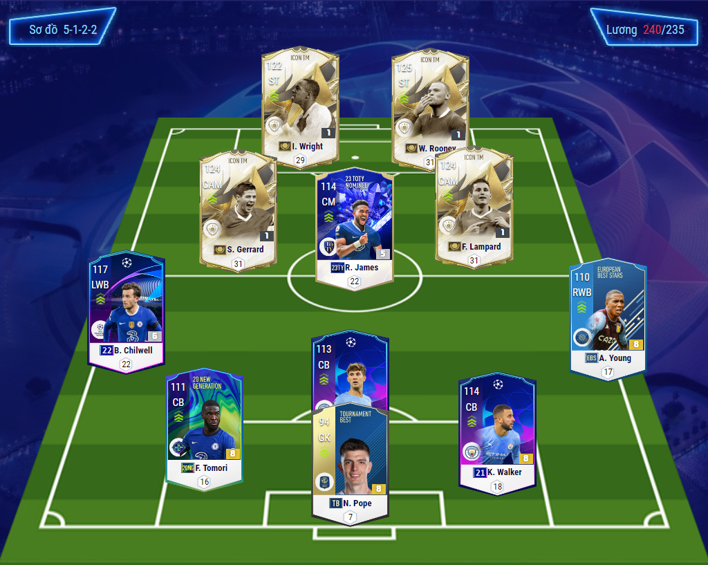 Lấy ví dụ ở đây là đội tuyển Anh với việc tối ưu được 4 cầu thủ ICON TM trên hàng công. Hiện tại thì Ian Wright cũng là một cầu thủ đã cho thấy sự khác biệt với vai trò thần phôi trước đây. Dù không có CDM trong đội hình nhưng vai trò của John Stone và Reece James có thể coi như kiêm luôn vị trí này mỗi khi đội nhà mất bóng.