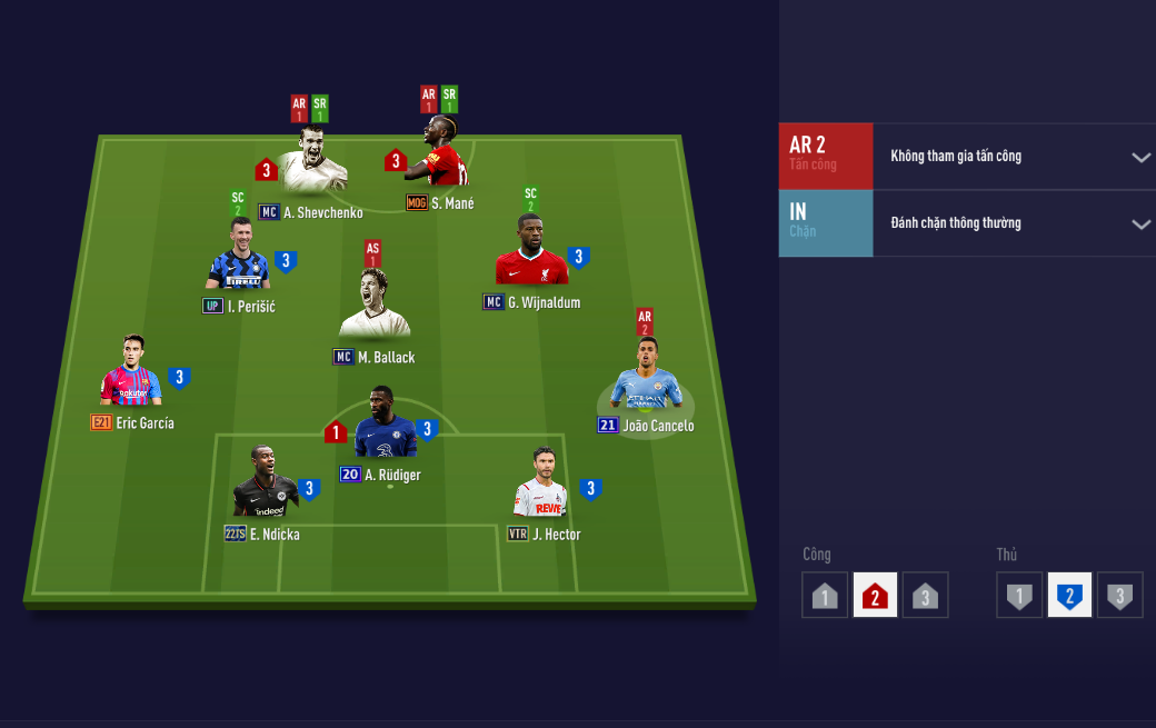 Với một gameplay mà các cầu thủ phòng ngự được nâng cấp AI khá tốt, việc chọn lựa một sơ đồ mang thiên hướng phòng thủ có vẻ ...không được đúng cho lắm. Tuy nhiên ở gameplay 9.0 này 523 với cách bố trí không CDM lại là làm tốt một việc là giải được bài toán 4222 và 42211.