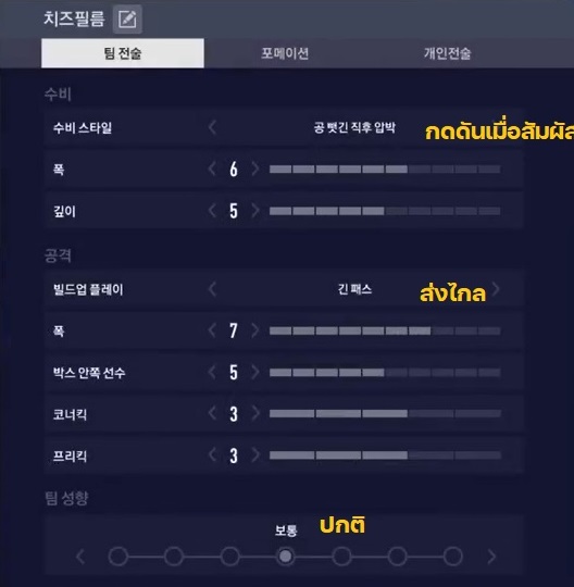 Cùng với đó là sử dụng "Đường chuyền dài" cho lối chơi tấn công với việc thường xuyên đẩy bóng cho 2 biên hoặc chọc khe dài cho 2 tiền đạo chạy chỗ để đa dạng hóa lối chơi tấn công.