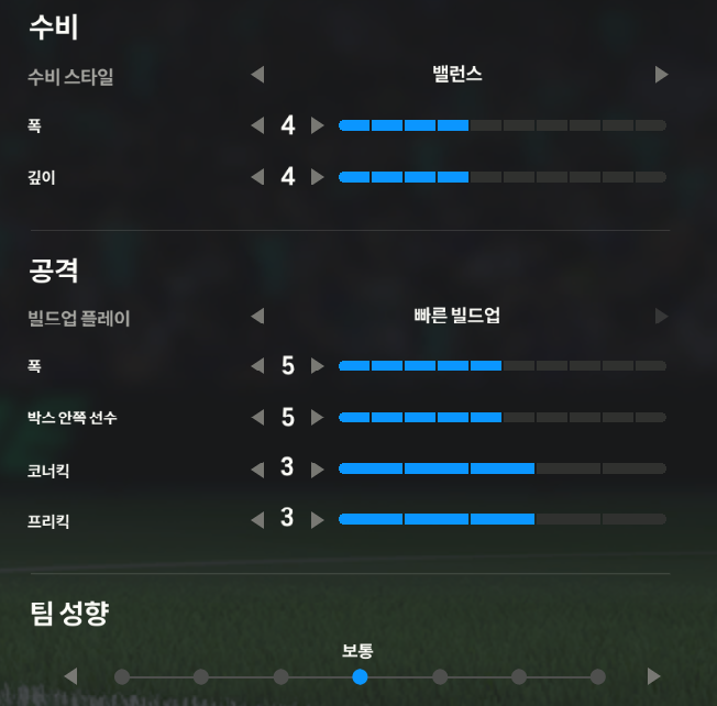 Lối chơi tương đối cân bằng trong phần cài đặt với lối phòng ngự "Cân bằng" và khi tấn công thì các bạn có thể cài đặt " Chuyển trạng thái nhanh" hoặc giữ lối tấn công "Cân bằng" nếu bạn thích bình tĩnh triển khai bóng.