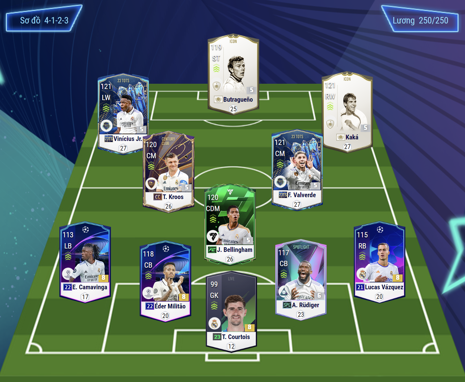 Sơ đồ chiến thuật 4-1-2-3 được thiết lập cơ bản và không có bất kì biến tấu riêng biệt nào trong cách sắp xếp, mọi thứ sẽ được chú trọng vào lựa chọn những cầu thủ sao cho phù hợp. Ở hàng tấn công, bộ 3 cái tên được lựa chọn là Butragueno ở vi trí tiền đạo cắm, đây là cái tên đang được nhiều game thủ yêu thích bởi rất phù hợp với meta hiện tại. Trong khi đó bộ đôi hành là cặp đôi Vinicius và Kaka, cả 2 đều có tốc độ và khả năng dốc biên ấn tượng cùng với đó phong cách chơi xâm nhập cut inside rất hay.
