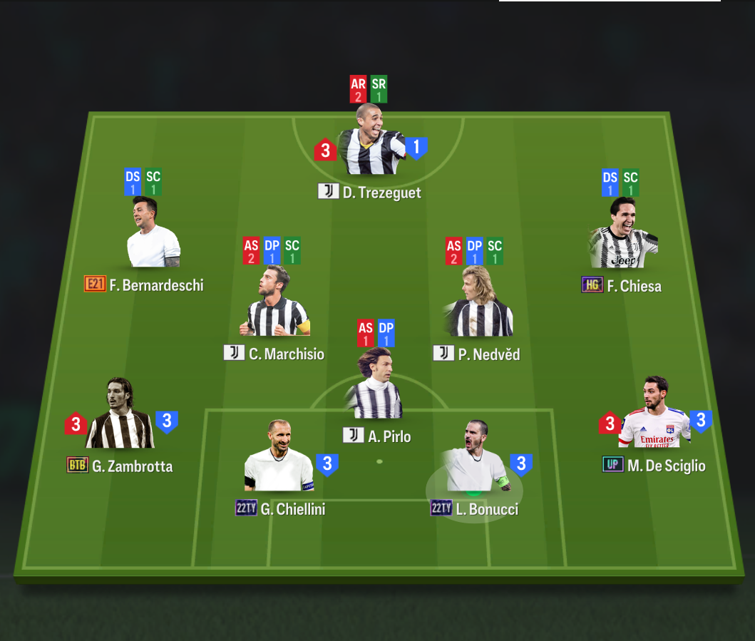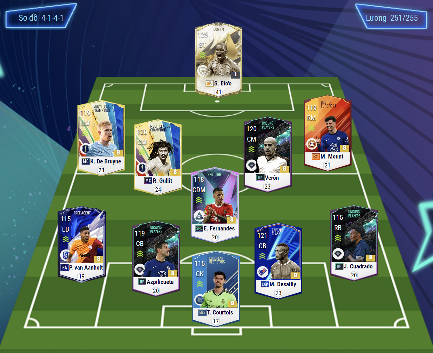 Sơ đồ được lựa chọn là sơ đồ 4-1-4-1 cho team color Chelsea với đầu tàu là Eto'o. Cái tên duy nhất sử dụng mùa ITM bởi sự bá đạo, hiệu quả cùng AI cực khôn của tiền đạo người Cameroon. 2 tiền vệ chạy cánh là sự lựa chọn của Mount và Debruyne +8.