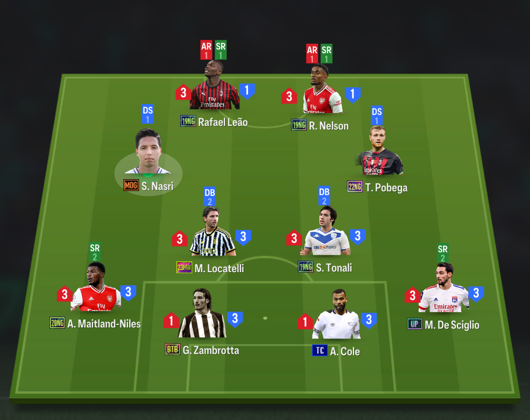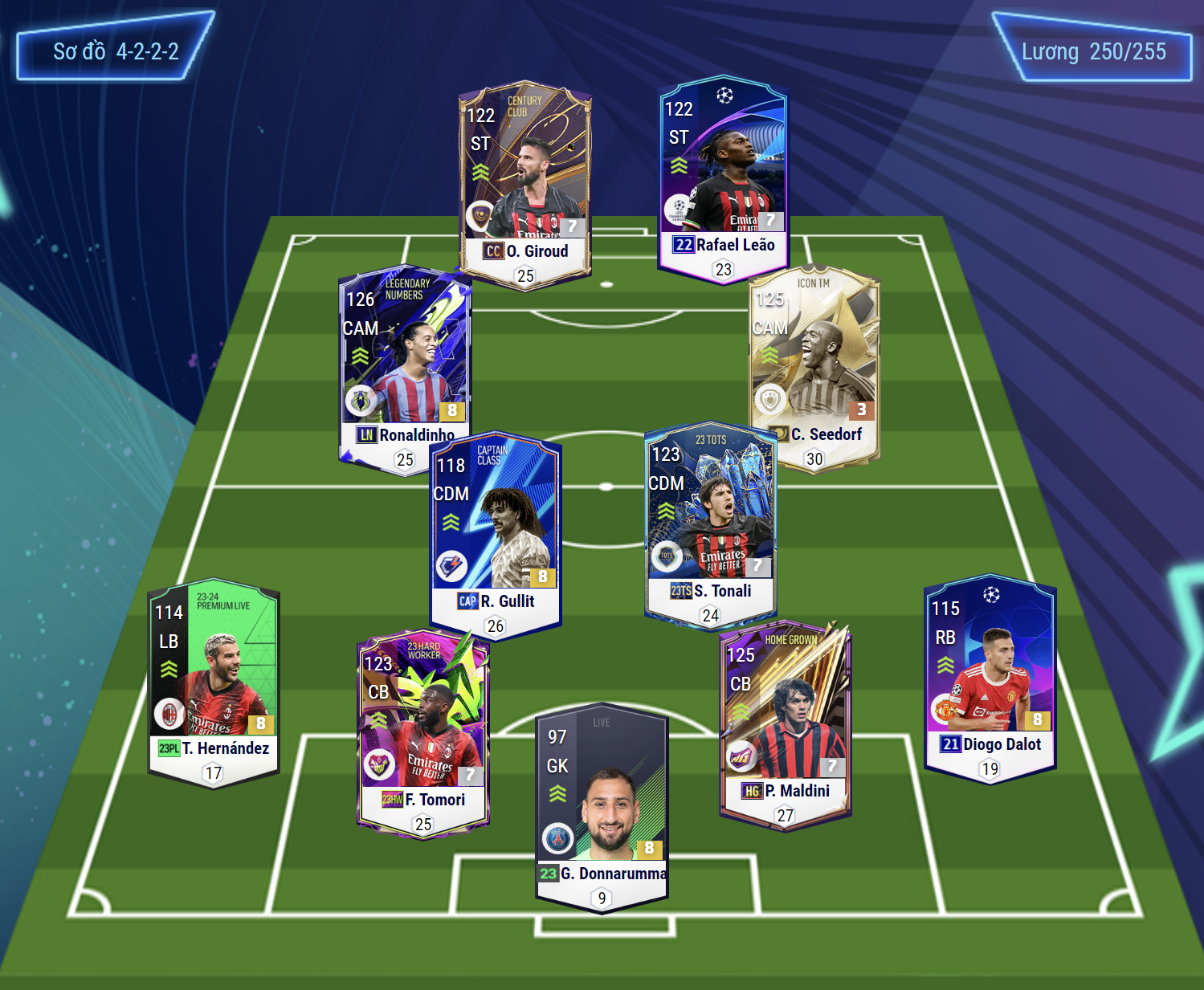 Sơ đồ được lựa chọn là sơ đồ 4222 cơ bản với 2 vị trí tiền đạo cắm LS,RS được lựa chọn là Giroud và Leao. 1 tiền đạo có khả năng chạy chỗ tốt, 1 tiền đạo có khả năng làm tường hiệu quả. Bộ đôi tiền vệ công lệch trái phải LAM, RAM với Ronaldinho và Seedorf đều là những cầu thủ chuyền tốt và sút hay thời điểm hiện tại.