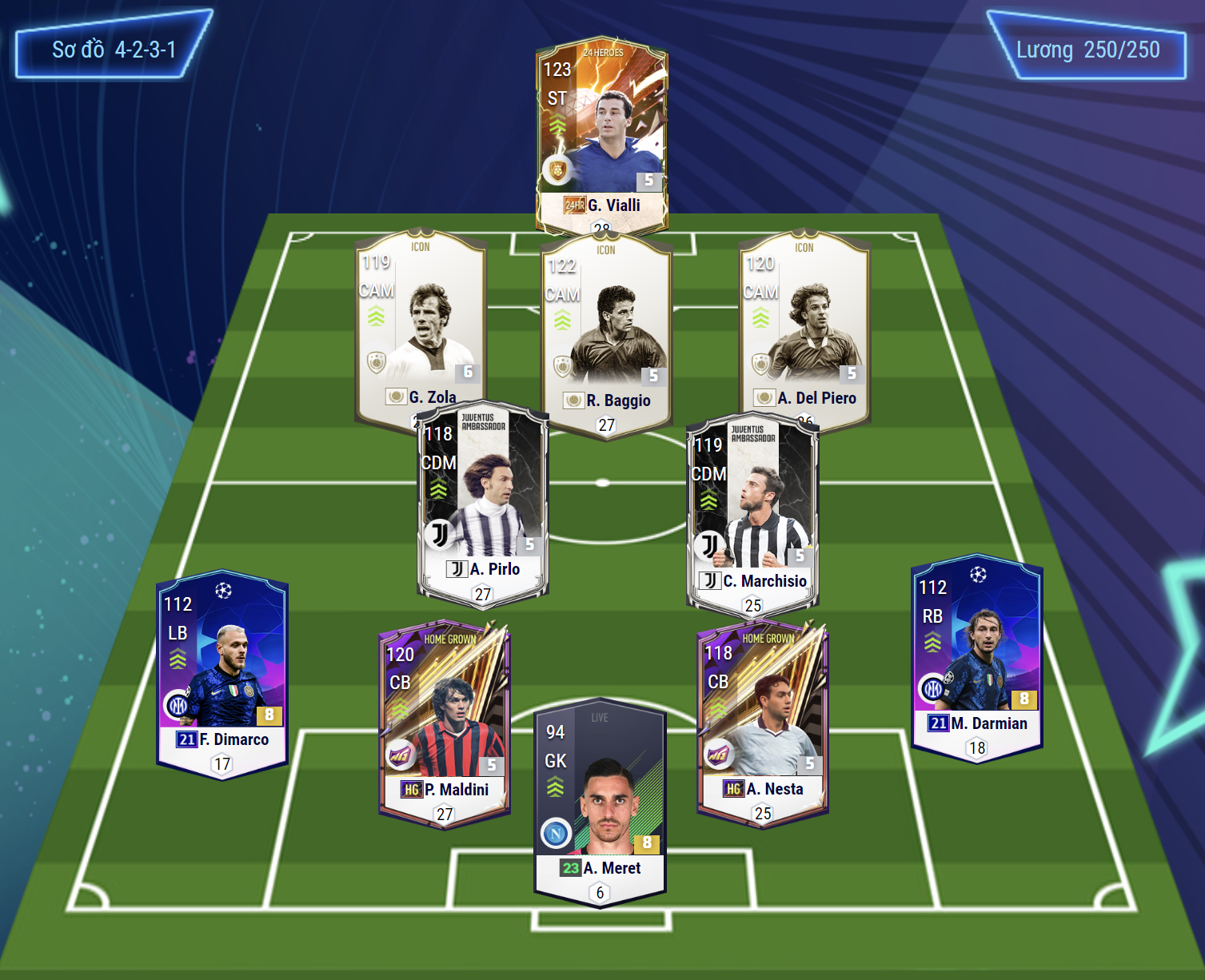 Sơ đồ được lựa chọn là sơ đồ 4-2-3-1 và để xây dựng một team color Italy hiệu quả thì việc lựa chọn nhân lực là vô cùng quan trọng. Vị trí tiền đạo là sự hiện diện của một cái tên mới nổi thời gian gần đây Vialli với khả năng dứt điểm tốt cả 2 chân cùng khả năng di chuyển thông minh.