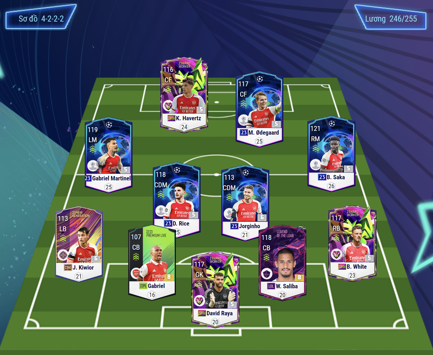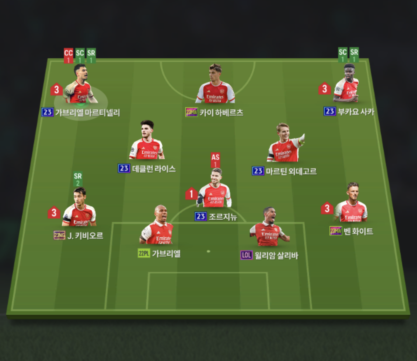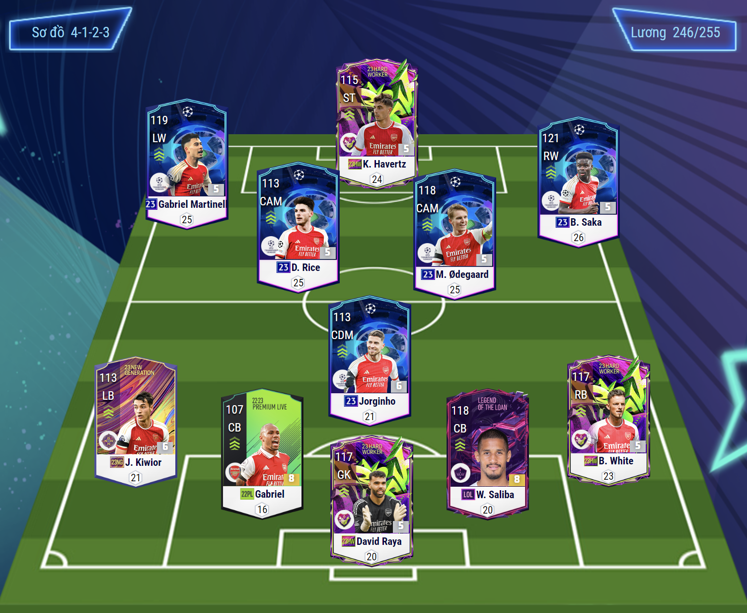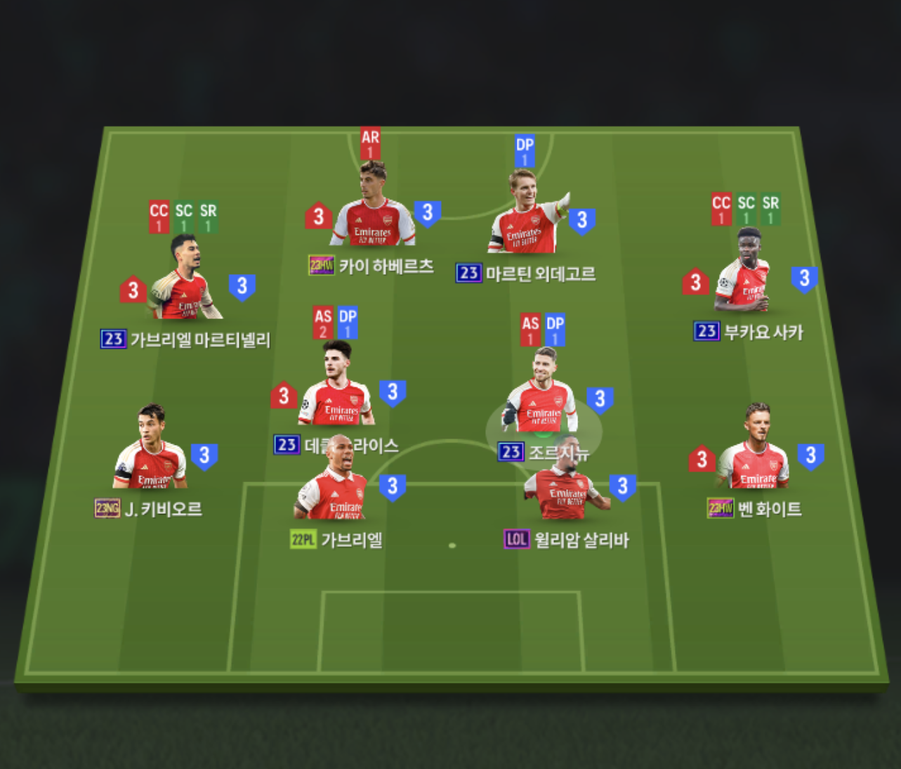 Triển khai lối chơi chuẩn với cách vận hành của Mikel Arteta ở sơ đồ chiến thuật ngoài đời thì trong game, sơ đồ được lựa chọn là sơ đồ 4-1-2-3 với bộ ba martinelli, saka và havertz trên hàng công. Bộ đôi tiền vệ công sẽ là Rice và Odegaard và tiền vệ trung tâm được lựa chọn là Jorginho. Bộ tứ vệ thời điểm hiện tại bao gồm Kiwior, Gabriel, Saliba và B. White.