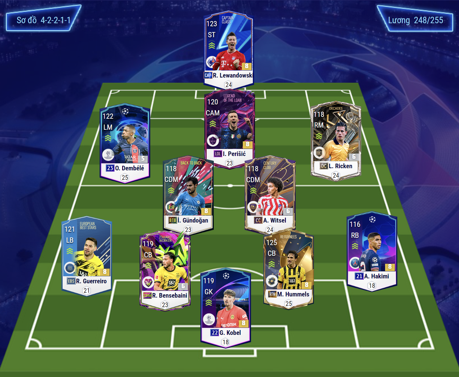 Sơ đồ 42211 được lựa chọn với đầu tàu chơi cao nhất trên hàng công là Lewandowski. Trong khi đó, tiền vệ công sẽ là Perisic, một trong những tiền vệ quốc dân cực kì đa năng. Cặp cánh được tin dùng là Dembele ở hành lang cánh trái, trong khi đó Ricken được lựa chọn thi đấu ở hành lang cánh phải.