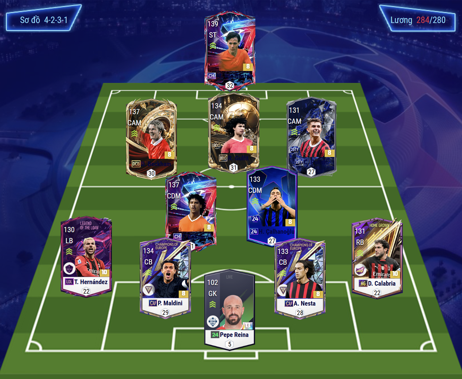 Sơ đồ 4231 được lựa chọn vừa phù hợp meta vừa đem lại hiệu quả tốt và phù hợp để tối ưu vị trí của bộ 3 Hà Lan Bay với Van Basten thi đấu ở vị trí tiền đạo cắm cao nhất trên hàng công sở hữu tốc độ tốt, khả năng dứt điểm toàn diện bằng cả 2 chân lẫn không chiến. Hỗ trợ phía sau là bộ 3 tiền vệ công Beckham, Gullit và Pulisic cho 3 vị trí LAM, CAM và RAM. Trong đó Beckham và Pulisic sẽ có xu hướng chơi bám biên còn Gullit sẽ đá như 1 hộ công vừa làm bóng phối hợp với tiền đạo vừa là chân sút xa tuyến 2 khi cần.