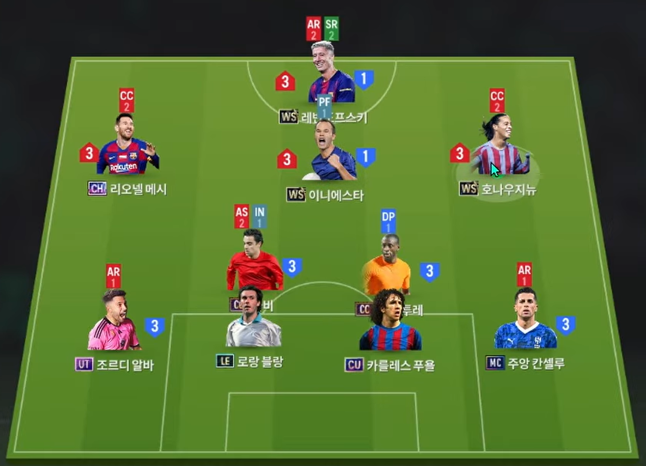 Sơ đồ 4213 được lựa chọn rất phù hợp với Barcelona với vị trí tiền đạo cắm ST được lựa chọn là Lewandowski, một trong những tiền đạo toàn diện sở hữu khả năng dứt điểm tốt bằng cả 2 chân cùng bộ kỹ năng không chiến và AI di chuyển ấn tượng. 2 tiền đạo cánh LW, RW lần lượt là Messi và Ronaldinho là những cái tên sở hữu tốc độ tốt, khả năng chuyền tạt ổn, xâm nhập biên và dứt điểm hiệu quả.