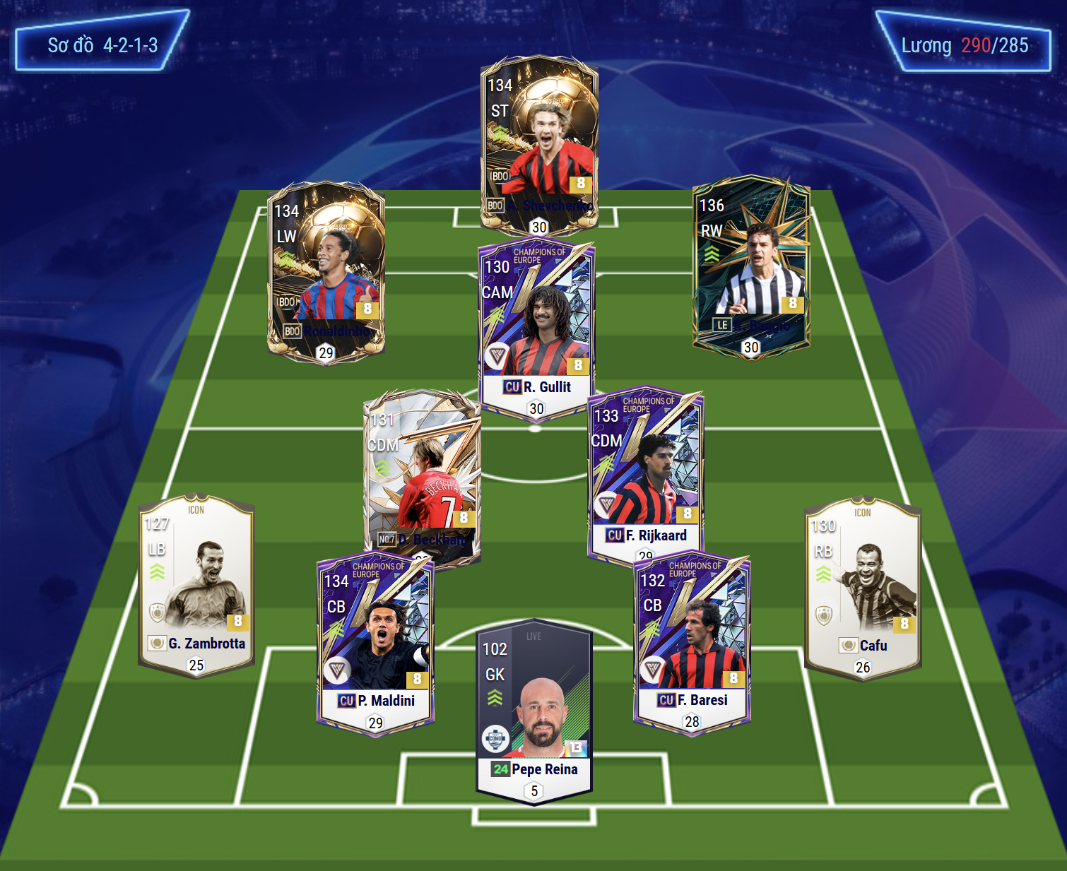 Sơ đồ 4213 được lựa chọn với vị trí tiền đạo cắm được lựa chọn là Shevchenko, một trong những tiền đạo cực kì chất lượng và toàn diện cho team AC Milan. Hỗ trợ 2 bên hành lang cánh là cặp tiền đạo cánh Ronaldinho và Baggio. Cả 2 cho thấy hiệu quả cực kì tích cực ở những tình huống khoét biên, với tốc độ ổn, AI xâm nhập khôn cùng khả năng rê dắt bóng ấn tượng.