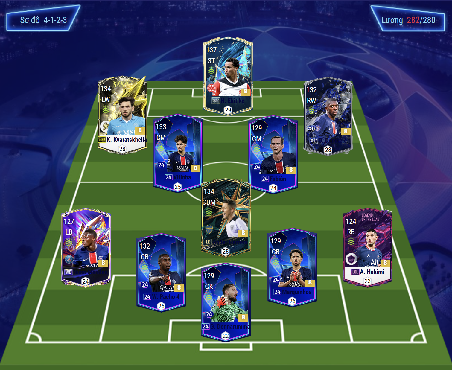 Sơ đồ 4123 được lựa chọn với vị trí tiền đạo cắm là Ekitike, cầu thủ sở hữu khả năng dứt điểm đa dạng cùng AI di chuyển thông minh. Hỗ trợ 2 bên hành lang cánh là bộ đôi Kvaratskhelia và Dembele, cả 2 đều là những chân chạy cánh quốc dân sở hữu tốc độ, kỹ năng dứt điểm tốt, khả năng chuyền tạt đa dạng và xâm nhập biên hiệu quả.