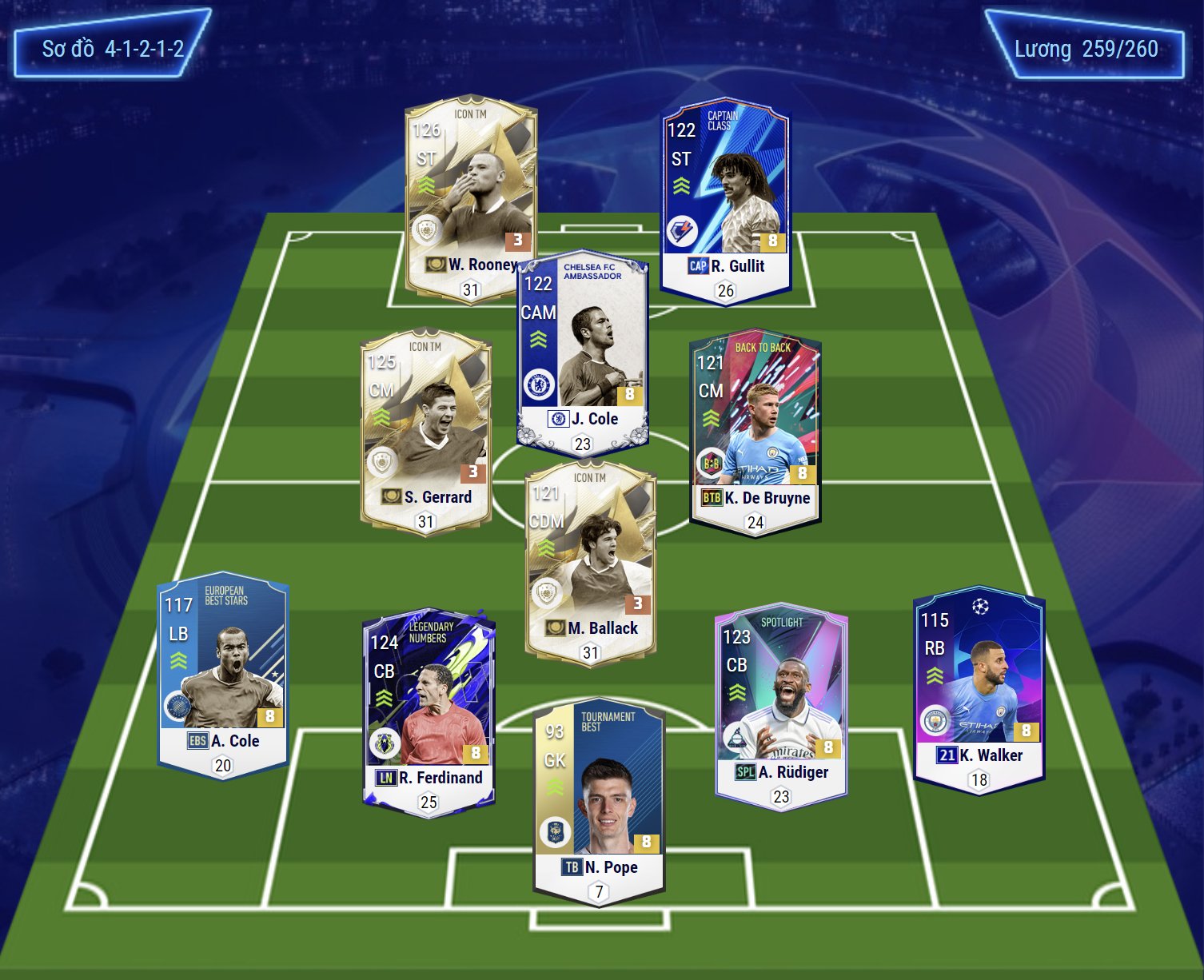 Cặp đôi tiền vệ trung tâm Gerrard và De Bruyne là 2 cái tên được tin dùng ở meta này. Phía dưới là vị trí của Ballack , một trong những cái tên toàn diện nhất game. Bộ tứ vệ với A.Cole và Walker ở hành lang cánh trong khi đó cặp trung vệ Ferdinand và Rudiger sẽ án ngữ trước khung thành của N.Pope.