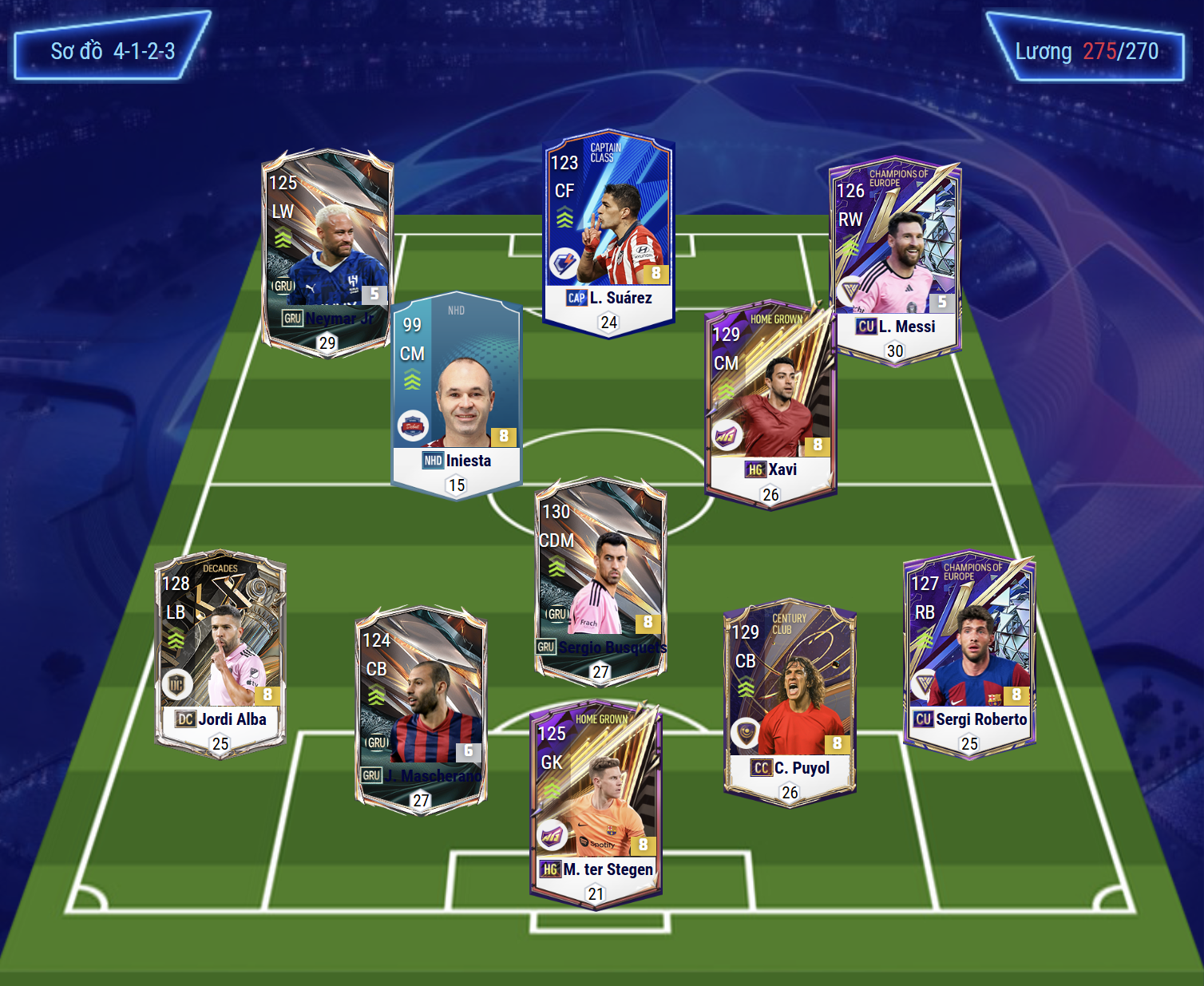 Sơ đồ 4123 được sử dụng với vị trí chơi cao nhất trên hàng công là Suarez. Bộ đôi tiền đạo cánh Messi và Neymar tạo nên bộ 3 MNS trứ danh từng khuynh đảo trời Âu một thời. Cặp đôi tiền vệ trung tâm với Iniesta và Xavi được xem là 2 tiền vệ huyền thoại của đội bóng xứ Catalunya.