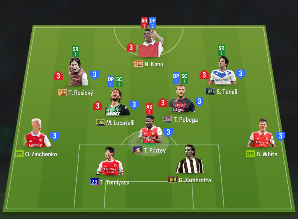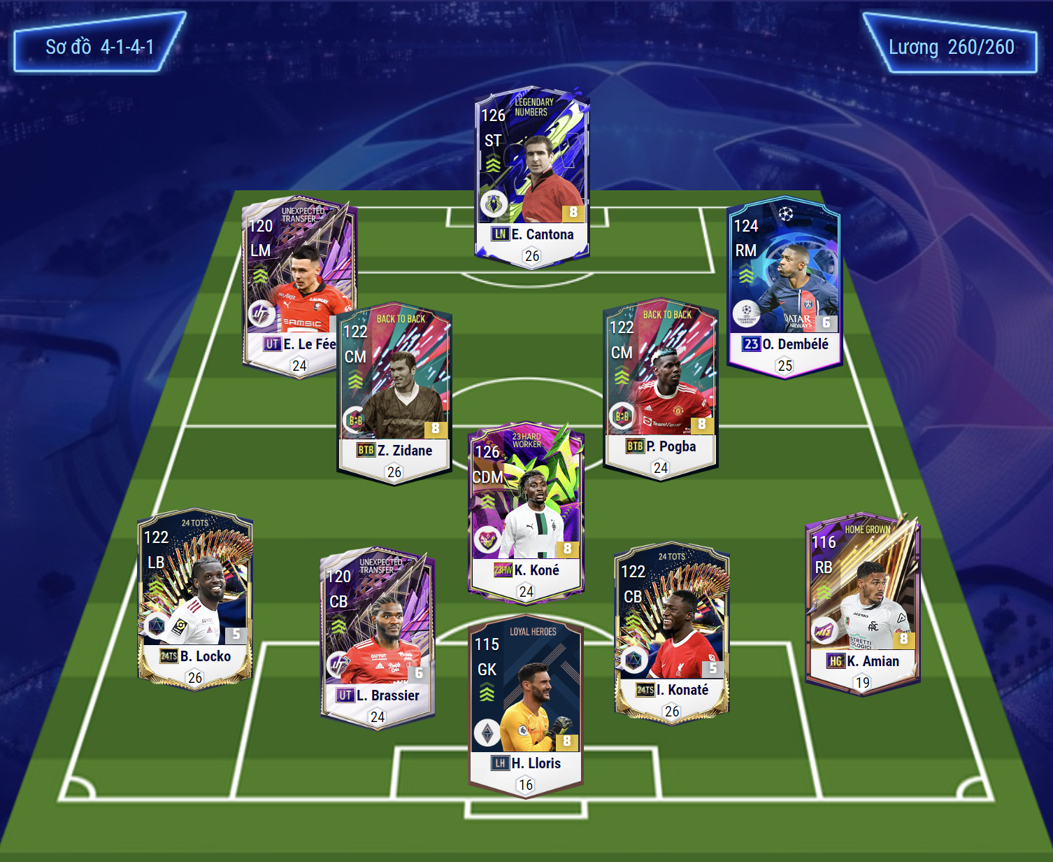 Sơ đồ 4141 được thiết lập với vị trí chơi cao nhất trên hàng công là Cantona, một trong những tiền đạo khá toàn diện trong game. Cặp đôi tiền vệ cánh được lựa chọn và tin dùng là Dembele và Le Fee, trong khi đó cặp đôi tiền vệ trung tâm được lựa chọn là Zidane và Pogba, cả 2 đều sở hữu kỹ năng chuyền bóng và sút xa xuất sắc.