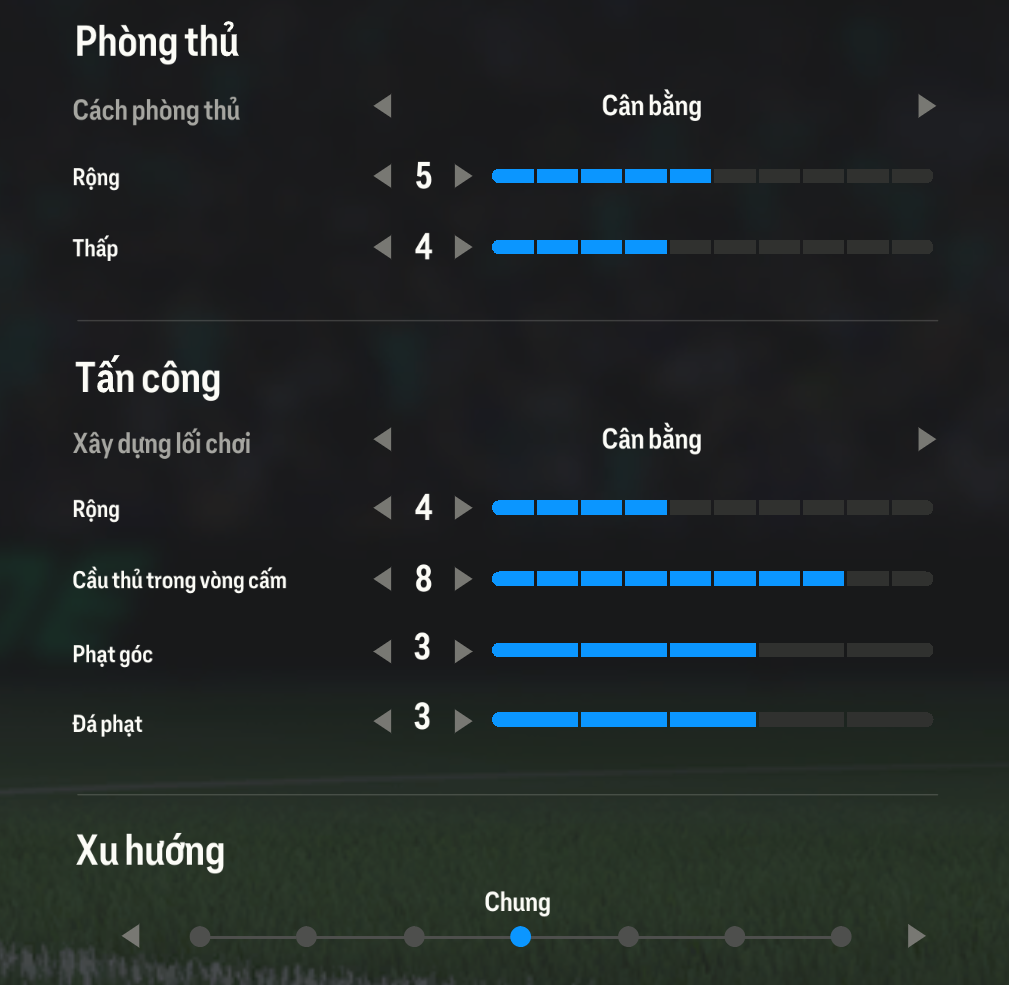 Trong khi đó, tấn công cân bằng cùng xu hướng 4-8 sẽ giúp đội hình dâng lên ở mức ổn, không quá nhanh và ưu tiên kiểm soát tuyến giữa nhằm tạo ra lợi thế trong các tình huống ban bật và tạo ra nhiều cơ hội ghi bàn.