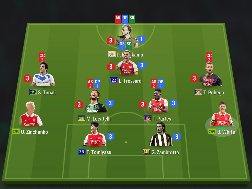 Sơ đồ được lựa chọn là sơ đồ 42211 mặc định, không có biến tấu nào ở các vị trí. Chơi cao nhất trên hàng công là Drogba, cầu thủ vừa có kỹ năng sút tốt vừa có khả năng không chiến hiệu quả. Tiền vệ công Gullit cũng toàn diện và đảm nhiệm vai trò hỗ trợ tấn công. Cặp đôi Zola và J. Cole thi đấu ở 2 bên hành lang cánh.