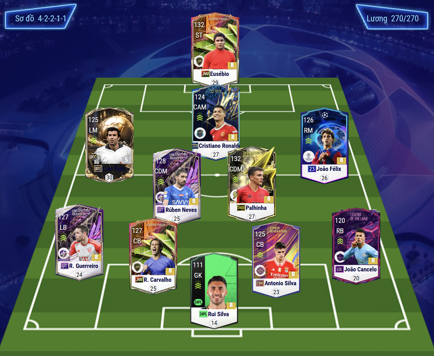 Sơ đồ 42211 với Eusebio là cái tên cao nhất trên hàng công. Trong khi đó, vị trí CAM là Cristiano Ronaldo, cầu thủ có khả năng thi đấu cực kì đa dạng trên hàng công. Cặp đôi tiền vệ cánh được chọn là Figo và Felix.