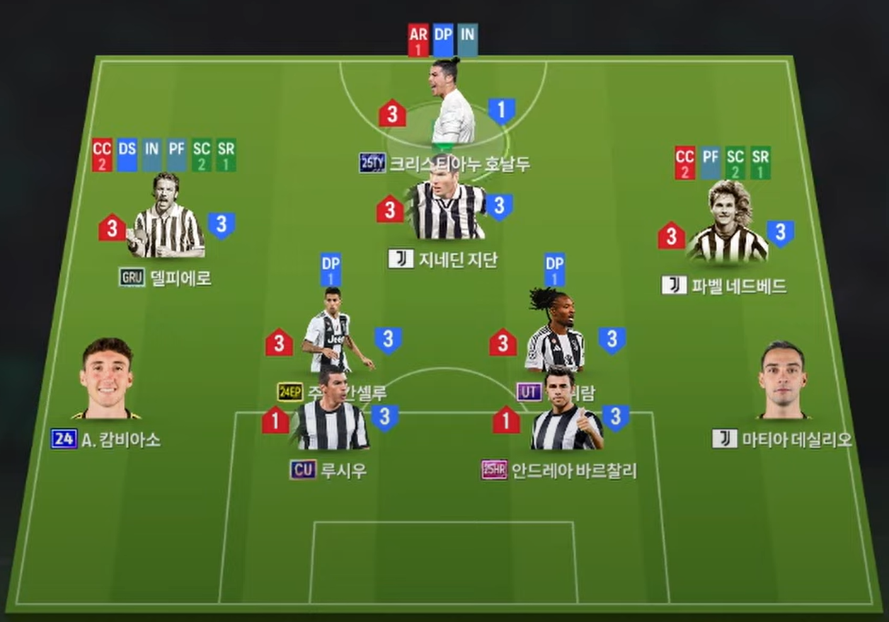 Sơ đồ 42211 được lựa chọn với vị trí tiền đạo cắm được tin dùng là Vialli, cầu thủ có khả năng ghi bàn nhạy bén cùng AI rất hợp meta hiện tại. Hỗ trợ phía sau là vị trí tiền vệ tấn công Zidane, một trong những cầu thủ quốc dân cho vị trí này từ chuyền bóng, hỗ trợ tấn công, dứt điểm ghi bàn cho tới tốc độ đều ổn. Cặp tiền vệ cánh Nedved và Del Piero cũng là những cái tên toàn diện.