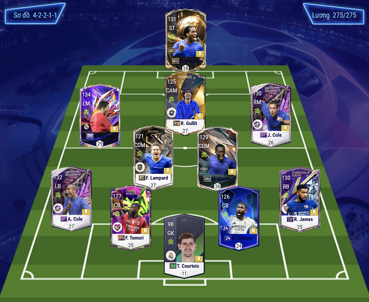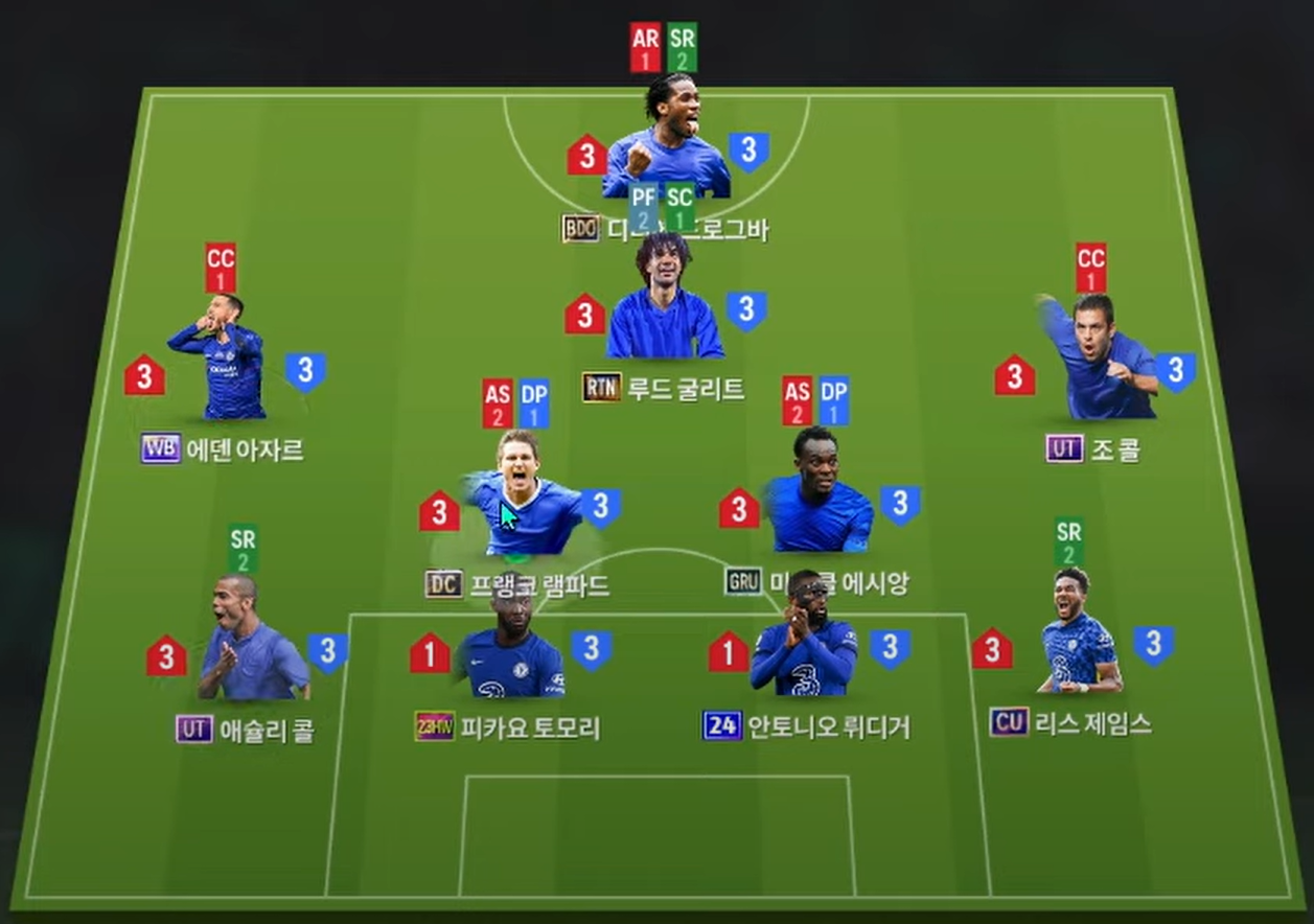 Sơ đồ 42211 được sử dụng với cầu thủ chơi cao nhất trên hàng công là Drogba cho vị trí ST. Hỗ trợ ngay phía sau anh là Gullit, một trong những cái tên cực kì chất lượng thời điểm hiện tại. Bộ đôi tiền vệ cánh là sự góp mặt của Hazard bên hành lang trái và J. Cole thi đấu ở biên phải.
