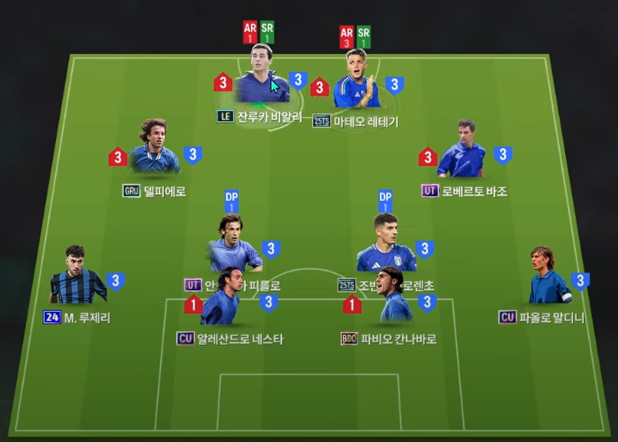 Sơ đồ 4222 được lựa chọn cho team color Italy với cặp tiền đạo được đánh giá tốt nhất hiện tại là Vialli và Retegui. Cả 2 đều là những cái tên chất lượng từ khả năng dứt điểm, không chiến cho đến AI di chuyển khá hiệu quả. Hỗ trợ phía sau là cặp tiền vệ công lệch cánh với Del Piero và Baggio vừa sở hữu tốc độ, khả năng chuyền tạt ấn tượng cùng những cú cứa lòng hiệu quả bằng cả 2 chân.