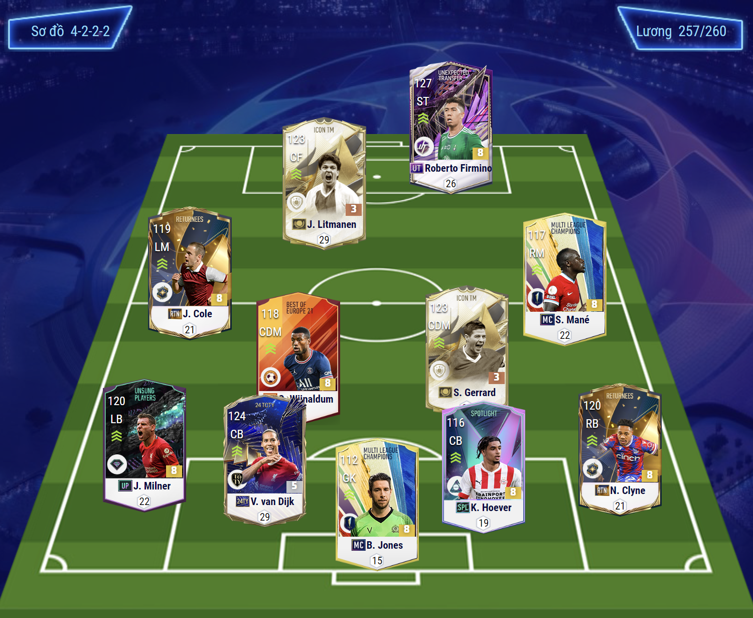 Ở meta hiện tại, khi sơ đồ 4222 là một trong những dạng sơ đồ an toàn, dễ tiếp cận và đem lại hiệu quả tốt thì team color Liverpool cũng được nhiều game thủ lựa chọn và triển khai sơ đồ này.