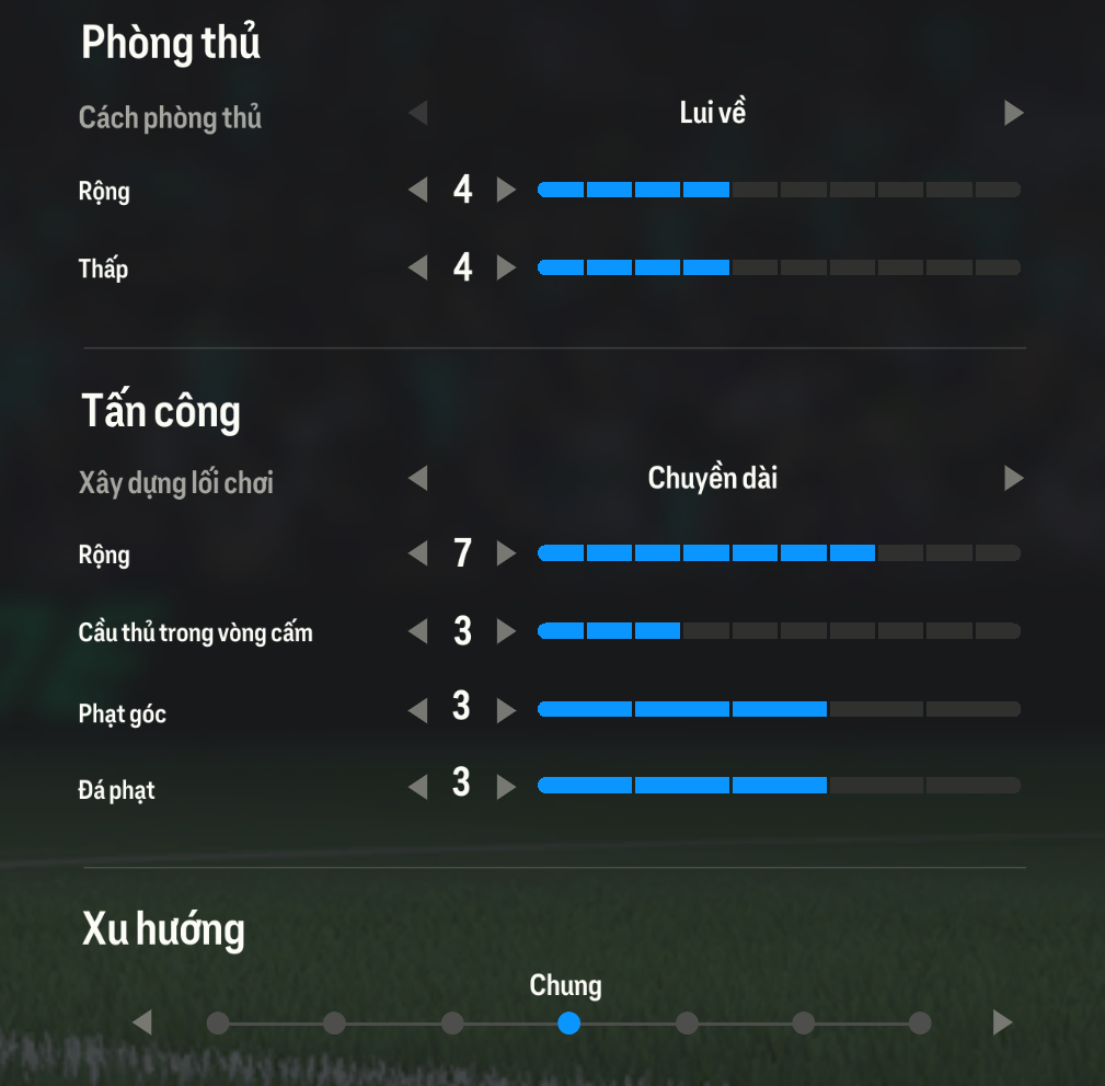 Chiến thuật đơn được thiết lập như hình nhằm tối ưu lối chơi và khả năng di chuyển của các cầu thủ.