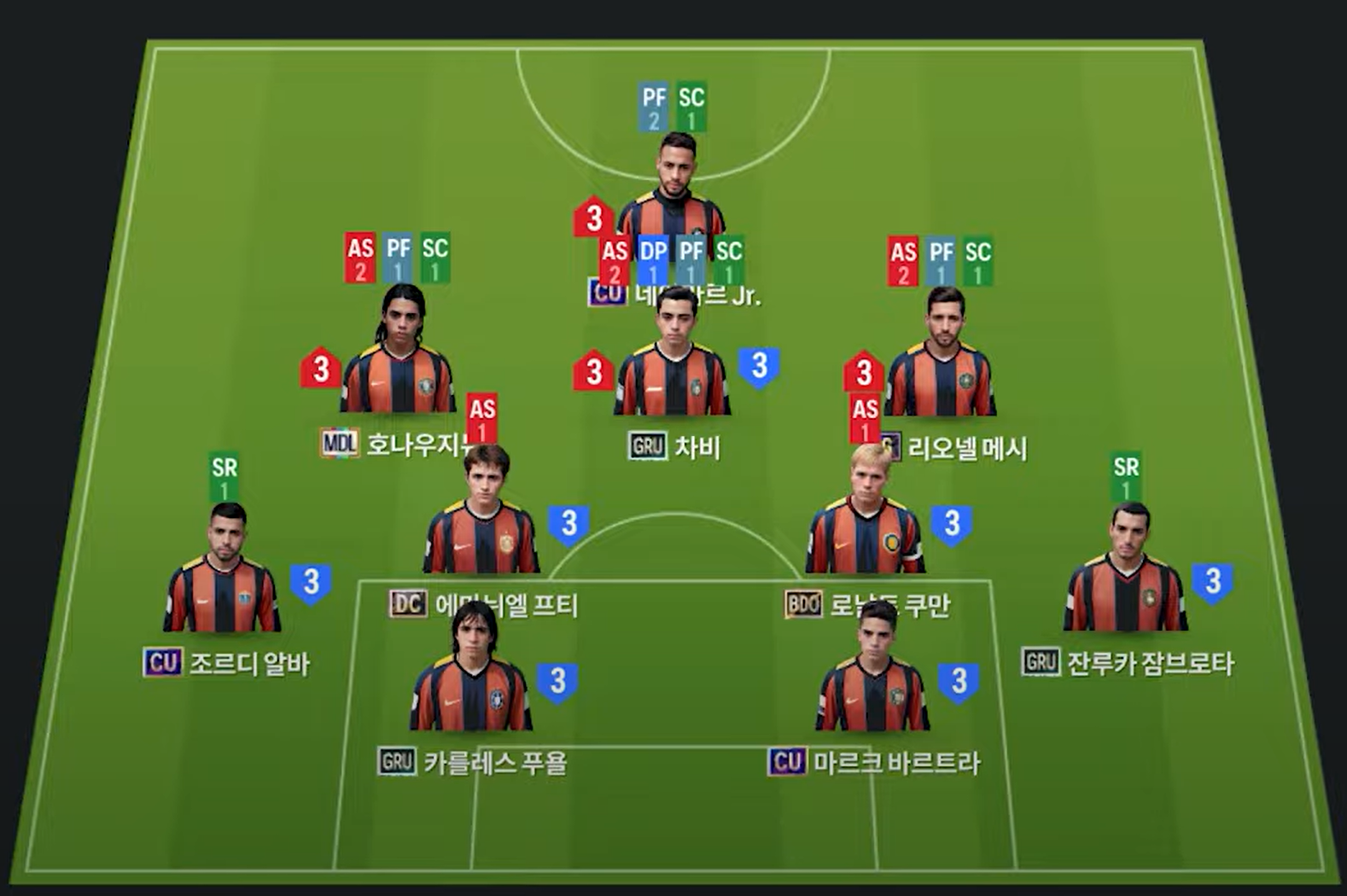 Sơ đồ 4231 không tiền đạo với vị trí cao nhất trên hàng công là CAM được lựa chọn là Neymar. Bộ 3 tiền vệ trung tâm LCM, CM và LDM lần lượt là 3 cái tên Ronaldinho, Xavi và Messi. Với Xavi, vị trí tiền vệ khu trung tâm tạo ra nhiều lợi thế chuyền bóng trong khi Messi và Ronaldinho vừa thi đấu ở khu vực trung tâm, vừa có thể dạt biên thi đấu.