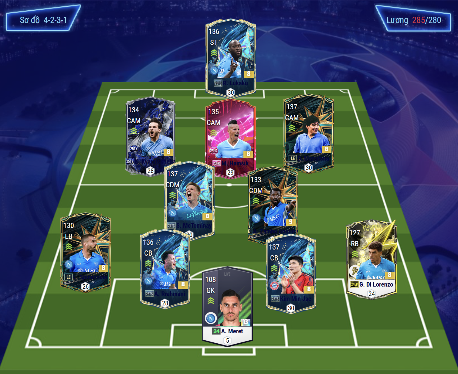 Sơ đồ được lựa chọn là 4231, dạng sơ đồ này sẽ tối ưu nhân lực của Napoli. Trong đó vị trí tiền đạo cắm là Lukaku, đây là một trong những tiền đạo tạo ra hiệu quả và đáng dùng ở thời điểm hiện tại của Napoli. Bộ 3 tiền vệ tấn công với Kvaratskhelia, Hamsik và Maradona, cả 3 đều là những mầu tiền vệ tấn công ấn tượng với Kvarat và Maradona sẽ có xu hướng bám cánh nhiều hơn trong khi Hamsik sẽ là cầu thủ hỗ trợ ở trung tâm hàng tấn công vừa chuyền bóng vừa sẵn sàng ghi bàn.