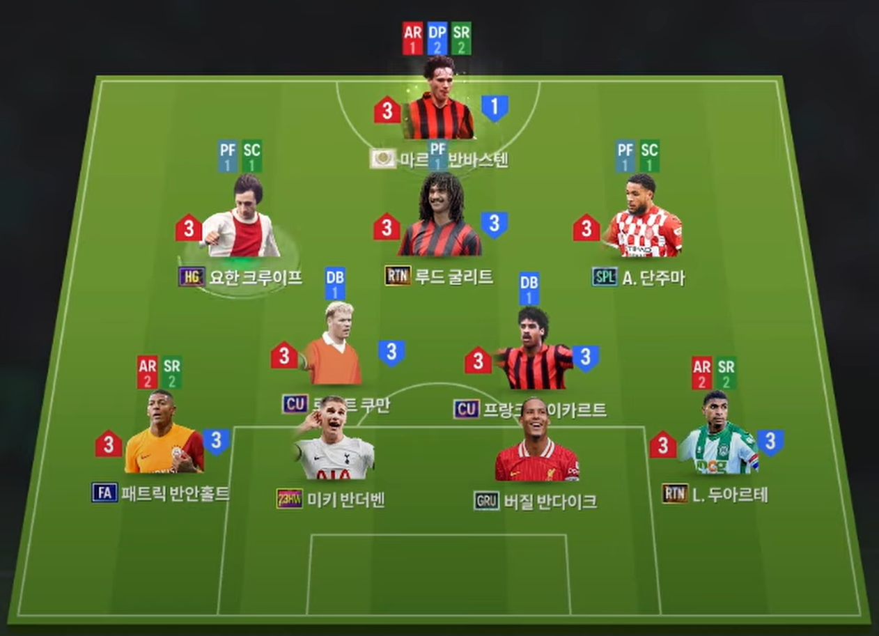 Sơ đồ 4231 được lựa chọn với vị trí tiền đạo cắm được tin dùng nhất thời điểm hiện tại là Van Basten. Bộ 3 tiền vệ tấn công LAM, CAM và RAM lần lượt là 3 cái tên Cruyff, Gullit và Danjuma. Đều sở hữu khả năng chơi bóng đa năng, tốc độ tốt với Gullit sẽ là thể hình tốt, khả năng chuyền sút và di chuyển hỗ trợ như một hộ công. Trong khi cặp đôi Cruyff và Danjuma sẽ thiên về tốc độ hơn và sẵn sàng bám cánh khi cần để đa dạng lối chơi tấn công.