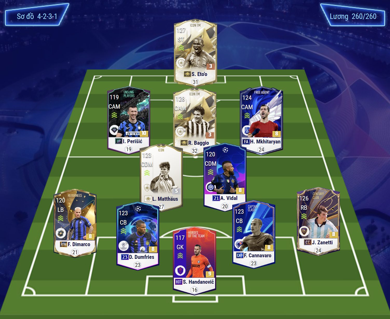 Trong FC Online, nhắc tới Inter Milan không thể không kể đến những cái tên hàng đầu như Ronaldo béo, Eto'o, Baggio, Perisic, Matthaus, Vidal, Dumfries... Đây đều là những cái tên chất lượng, thi đấu hiệu quả trong rank xếp hạng và có khả năng thi đấu đa dạng.