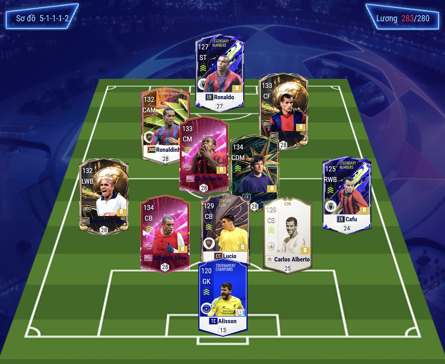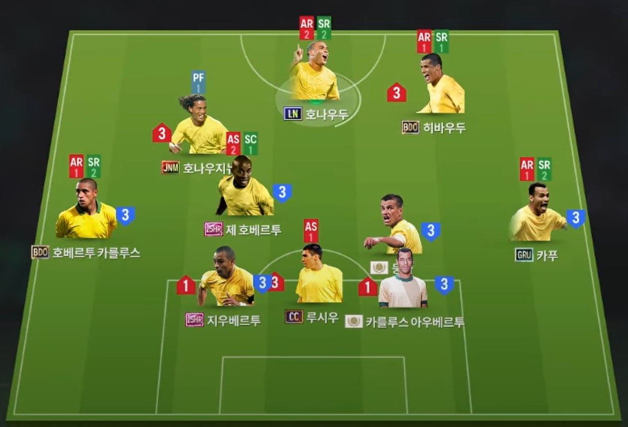 Sơ đồ Brazil năm đó là dạng sơ đồ 523 biến tấu và được tái hiện lại thành 51112. Trong đó vị trí tiền đạo cắm của Ronaldo de Lima, một trong những mũi nhọn tấn công hàng đầu của Brazil, thi đấu ngay phía sau là Rivaldo cho vị trí RF, đây là một trong những kèo trái xuất sắc hàng đầu FC Online. Ronaldinho với vai trò LAM sẽ có xu hướng hơi bám biên 1 chút nhưng cũng tạo ra bộ 3 mũi nhọn tấn công hiệu quả.